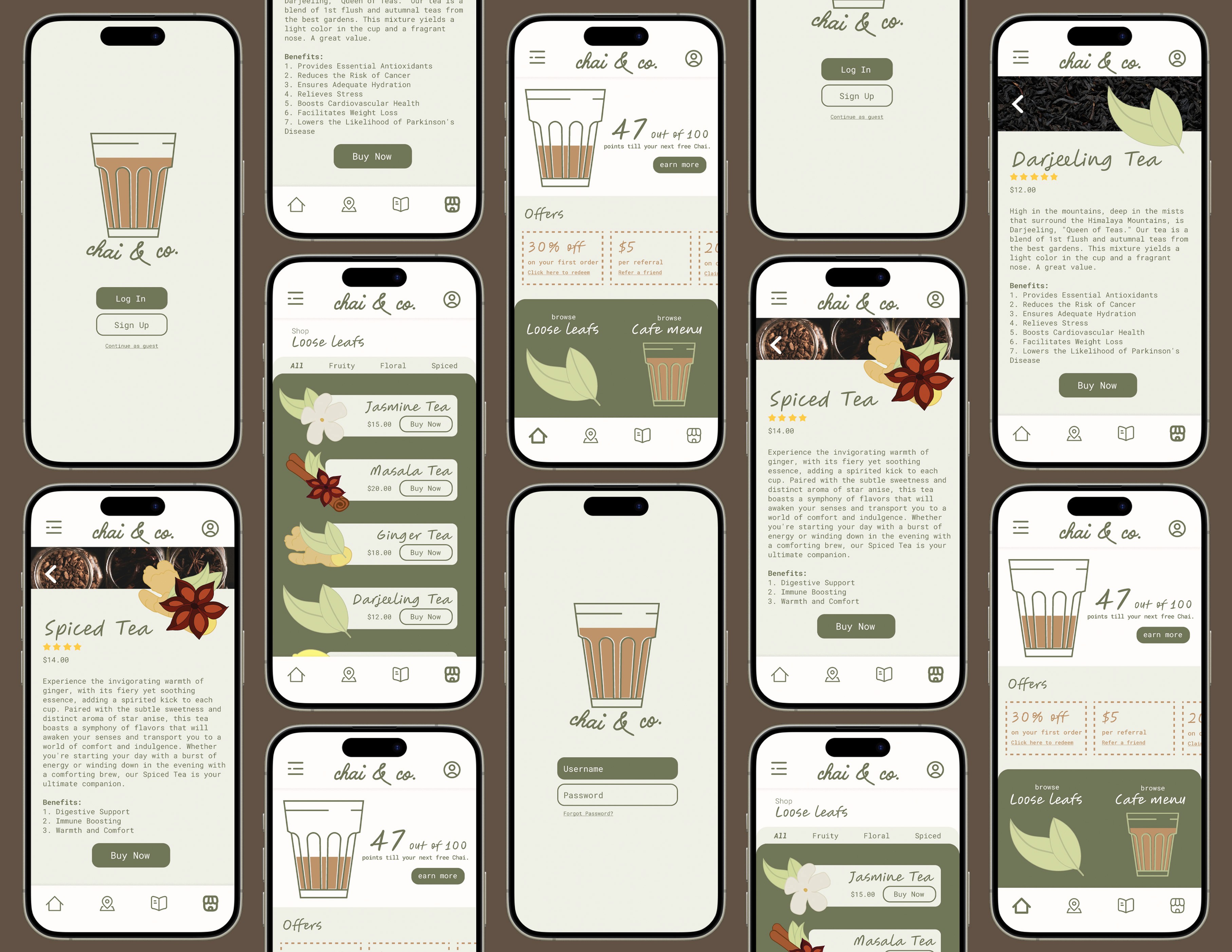 Chai & co. is a prototyped tea app that combines a loose-leaf shop andcafé menu in one platform. The project develops a mobile UI experience through a splash screen, home dashboard, filterable catalog, item pages, and navigation. These design choices position the app as an approachable yet elevated destination for tea enthusiasts.